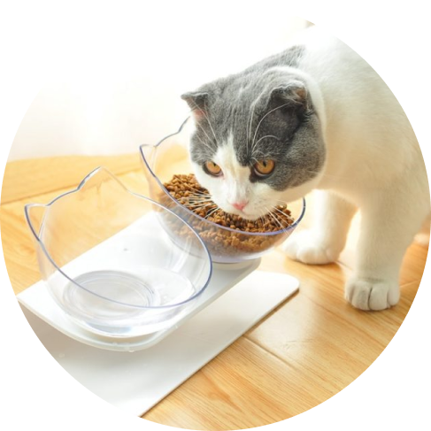Bought this for my aging cats thinking it would help them eat and swallow better. My kitten loves eating out of them! Not sure if these bowls are actually helping anything but they are cute and my cats are eating out of them. However, I will agree with some other comments. You really can't put water on one side. The bowl doesn't hold much without spilling out. So I use both bowls for dry food and keep another bowl for water. If anything, the bowl is cute and sturdy.