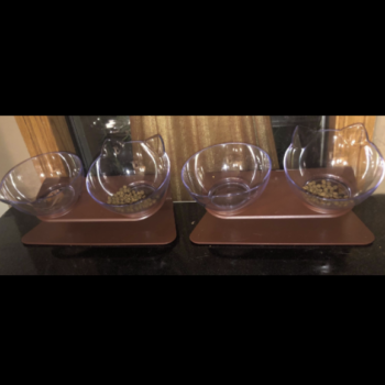 I've been looking for a simple solution to keep the chihuahua dog out of the cat food. These clear plastic bowls fit securely in the holder, ( also plastic) but the bowls are tipped toward the cat . For whatever reason, the dog hasn't even tried . The cat's been giving him the side eye while eating, but even she is starting to relax about it. I chose the brown dish holder , which is more of a bronze tone, and blends into my hardwood floor.. I'm kinda sick of bright colored and cutsie pet gear. Try these... you'll like them! PS: i use one side for kibble, and he other for canned food. These arent really for water. Use separate water bowls