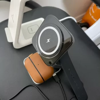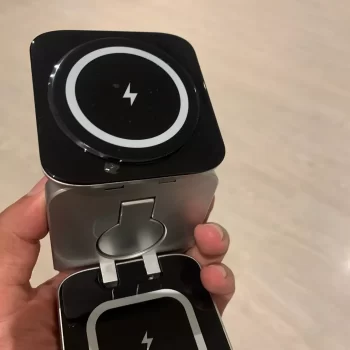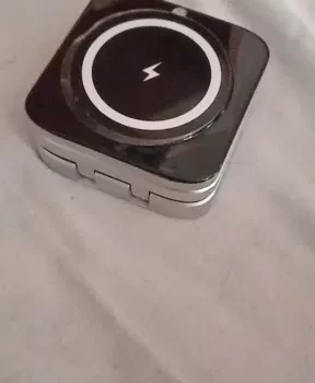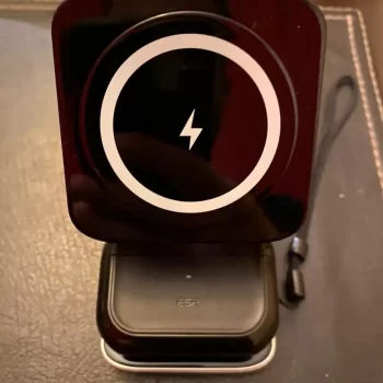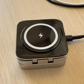 This charger is compact and great for travel. It charges my phone and watch effectively. The phone magnet is quite strong, ensuring the phone stays in place, while the watch magnet is a bit weaker. However, the design still secures the watch for charging. It's not the fastest charger, but it's efficient enough to charge a large iPhone overnight.